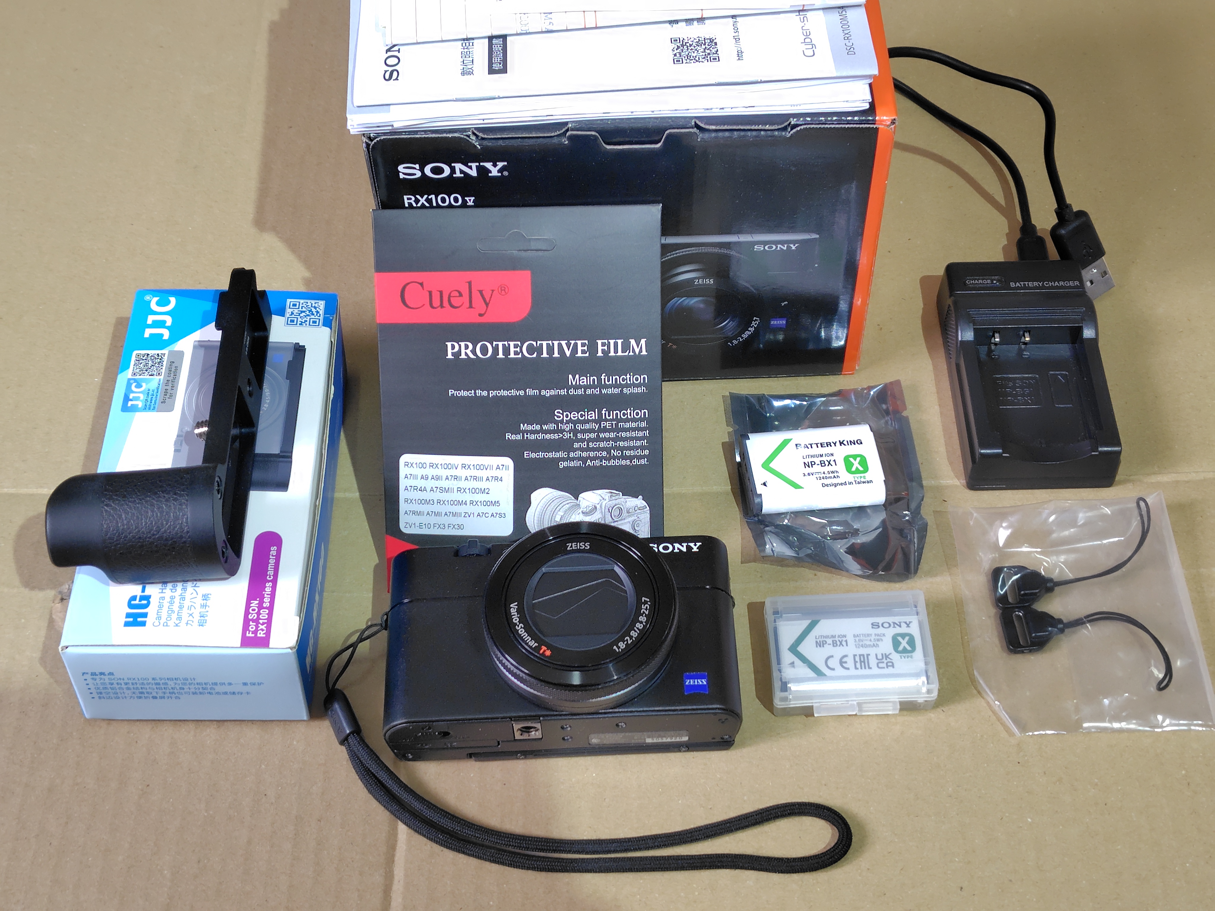 內容與配件:相機本體、盒單和原廠副小配件、原廠電池、副廠台灣製電池、充電器、JJC金屬握把、新的螢幕鋼化膜一張(全如圖)